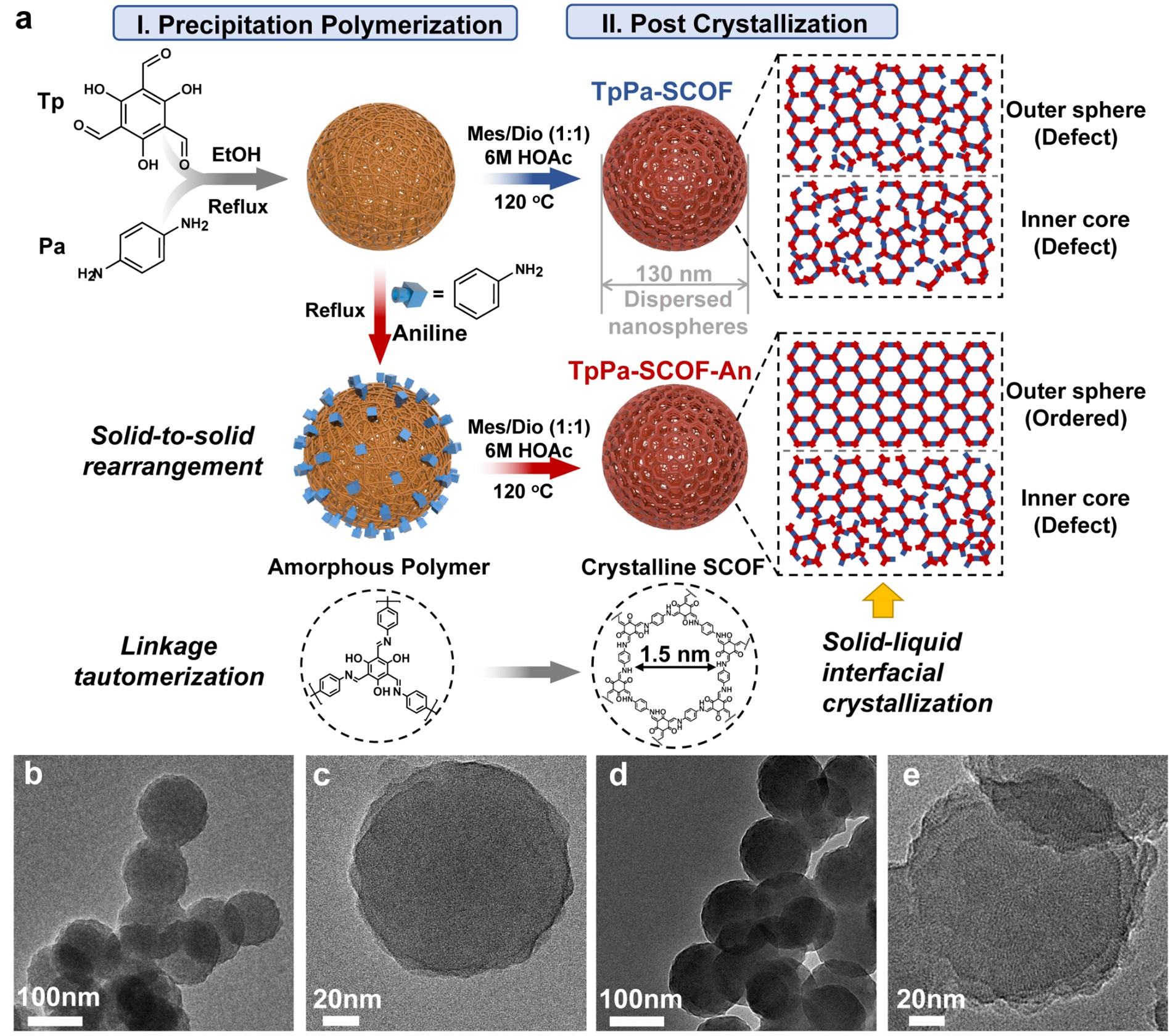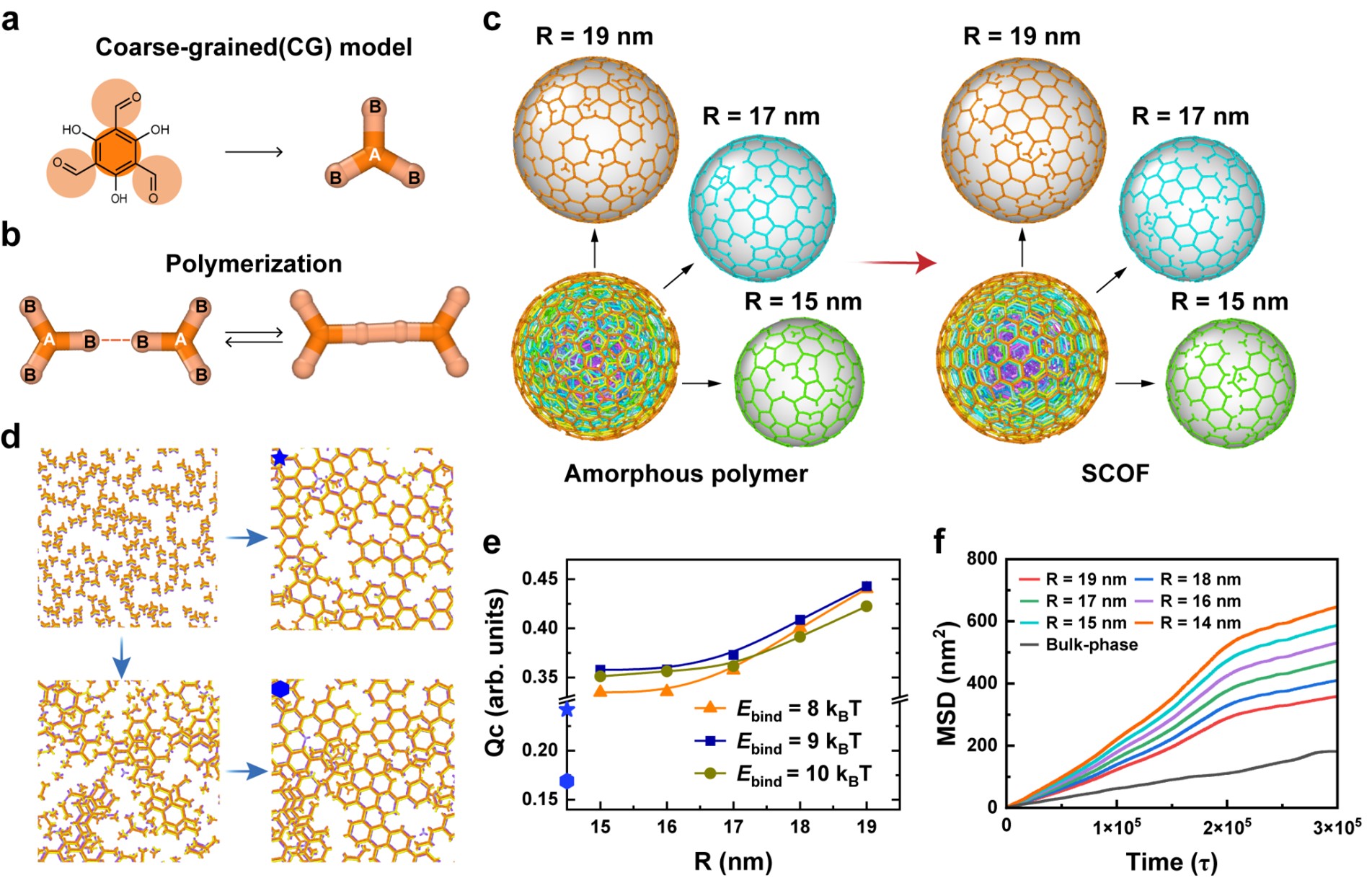 首先研究团队通过动力学模拟发现,与传统的“自下而上”COF生长方式截然不同,在无定形预聚微球表面连接调节剂,能够增强表面生长的动态可逆性,从而实现COF微球从内到外结晶度的增加。通过这种精细调控,不仅使得COF材料表面局域的结晶性增强,还能控制球形貌以及均一粒径。