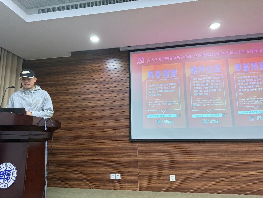 研究生第一党支部书记李维航同志带领党员们共同回顾了两会期间的重要议题和决议。从国务院总理李强所作的2025年政府工作报告,到王沪宁代表政协第十四届全国委员会常务委员会所作的工作报告,党员们逐字逐句研读,深入领会国家发展的战略部署和政策导向。随后,李维航面向支部全体党员进行了以“深入理解教育对科技和人才的支撑作用”为题的报告。经过热烈的学习与讨论,大家深刻认识到,在新时代背景下,教育、科技、人才已然成为国家发展的核心要素,三者相辅相成、缺一不可。