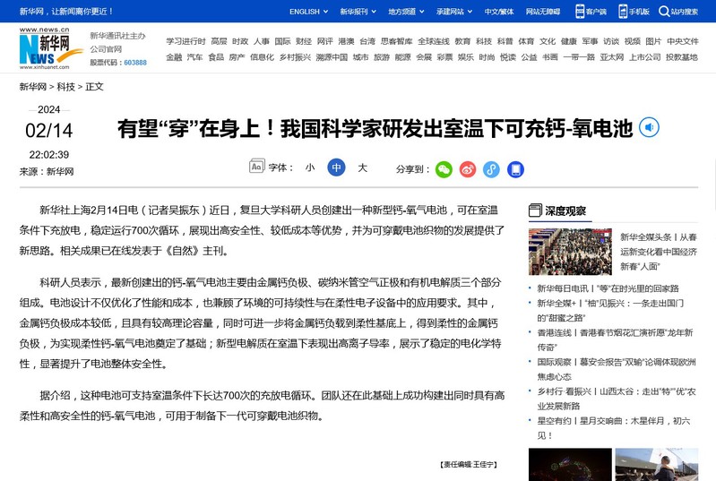 据介绍,这种电池可支持室温条件下长达700次的充放电循环。团队还在此基础上成功构建出同时具有高柔性和高安全性的钙-氧气电池,可用于制备下一代可穿戴电池织物。
