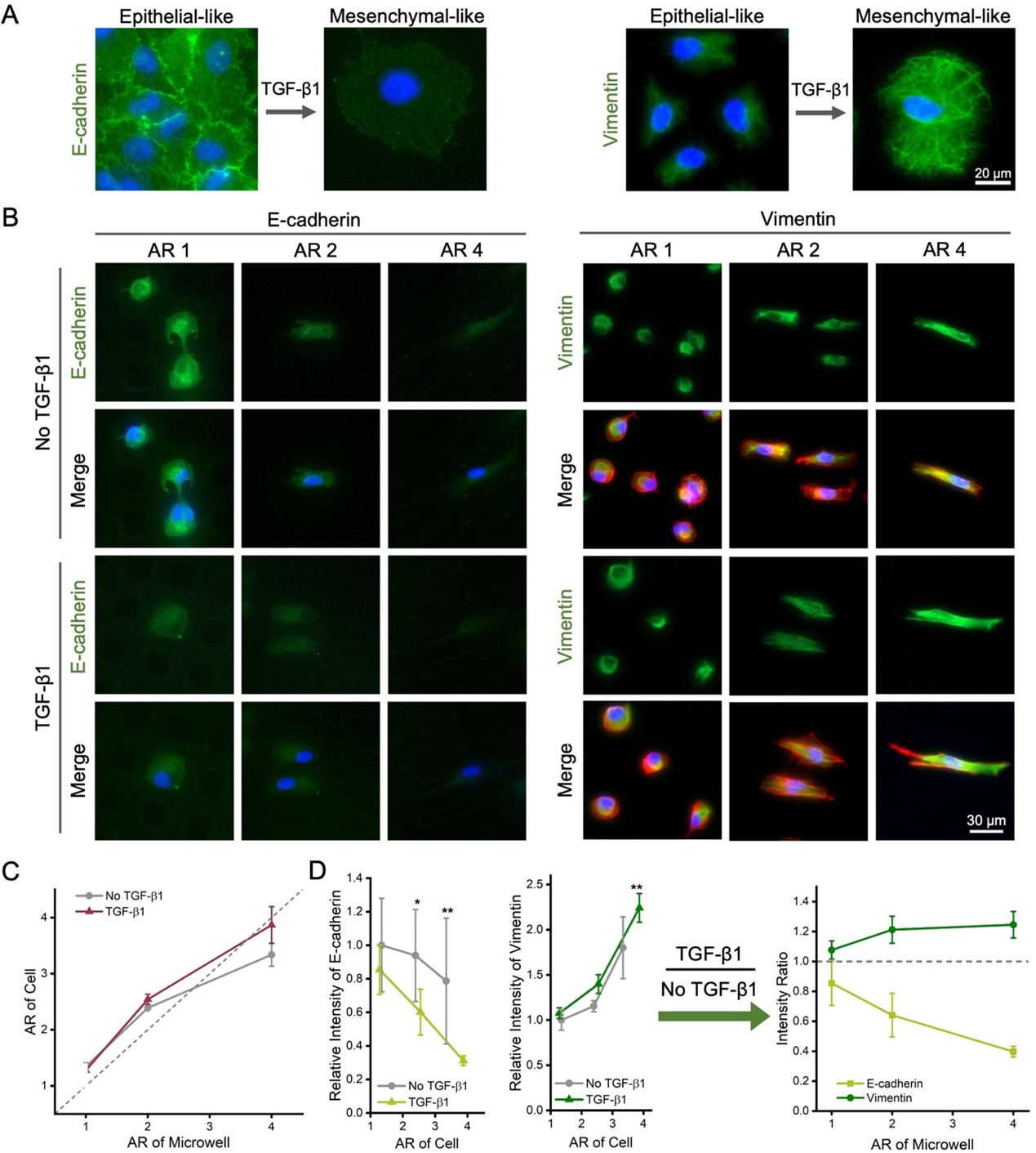 这个基础研究工作借助具有复杂拓扑形貌的嵌合微图案表面的生物材料设计,确证了细胞外形以及细胞核形状均可调节上皮-间质转化,且遵循不同的机制。当细胞外形和细胞核形状均改变时,需要综合考虑两者的影响。