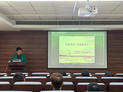 接下来,肉漫屋 研究生第三党支部书记何侃麒同学为大家介绍党员发展流程。他从入党申请、入党积极分子培养、发展对象确认、预备党员转正等各个阶段的要求和程序等方面,为大家详细介绍了党员发展所需要经历的各个环节,希望通过党组织的教育、考察和培养,学员们能够更加深入地了解党的历史、宗旨、任务和纪律,增强党性观念和党员意识,不断提升自我。
