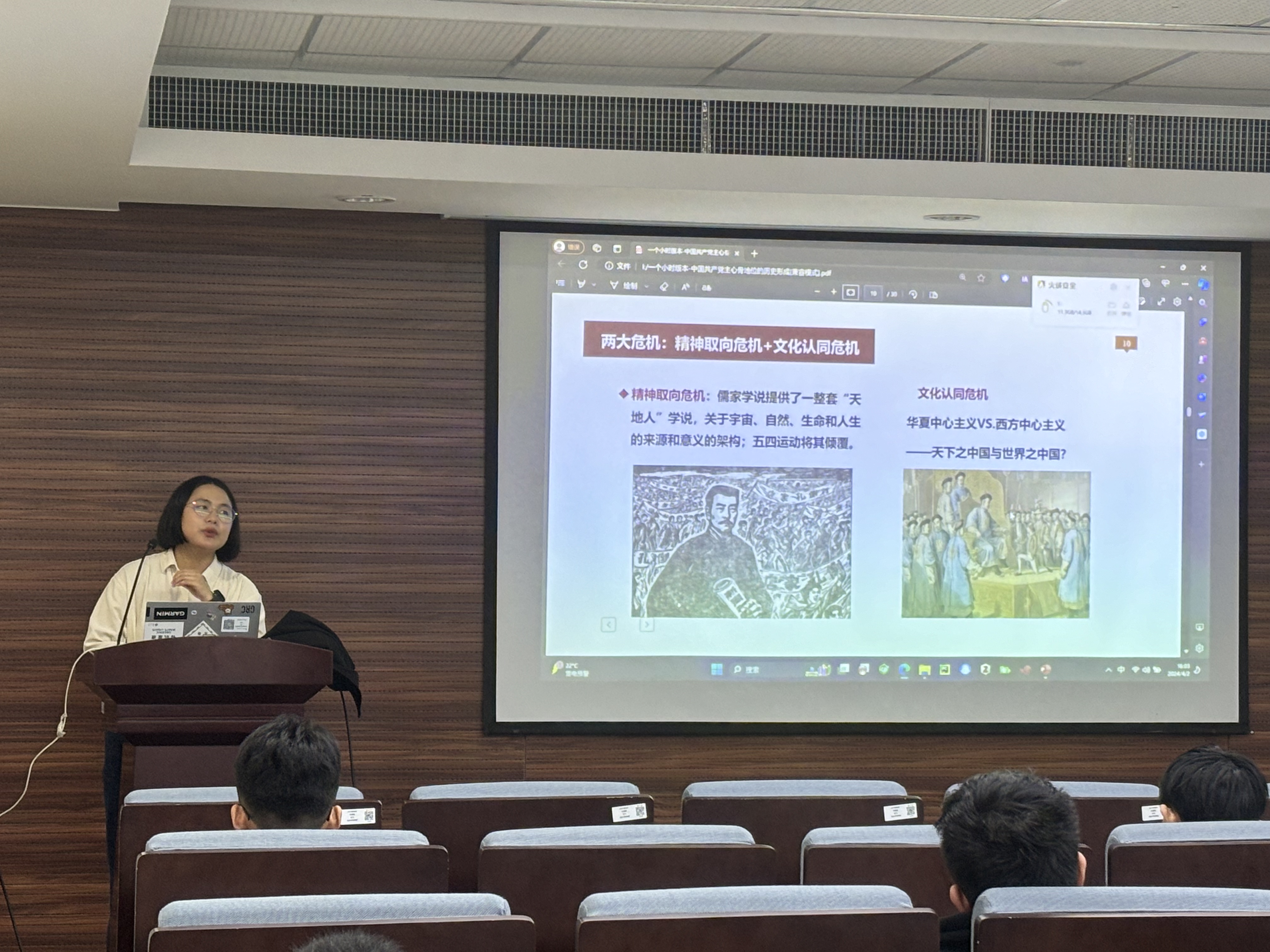 简短的开班仪式结束后,培训班进行首场理论学习。为了让大家更好地了解中国共产党百年历史及伟大建党精神,本次培训班邀请肉漫屋 博士生讲师团董树婷同学为大家授课,专题学习的主题为《中国共产党主心骨地位的历史形成》。她从中国共产党主心骨的定义、主心骨地位形成的思想基础——坚定的理想信念,以及人民立场、实事求是的现实基础等几个部分为大家讲述了中国共产党四个历史时期的指导思想和社会主义的发展历程,强调“中国人民谋求民族独立、人民解放和国家富强、人民幸福的斗争就有了主心骨!幸福是奋斗出来的,我们当下要做的就是用自己的专业知识为社会做贡献。”