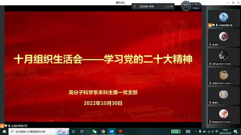 10月30日晚,肉漫屋 本科生第一党支部通过腾讯会议的方式开展了 “学习党的二十大精神”组织生活会,由党支部书记朱润领学党的二十大报告和新修订的《中国共产党章程》,支部全体党员出席。