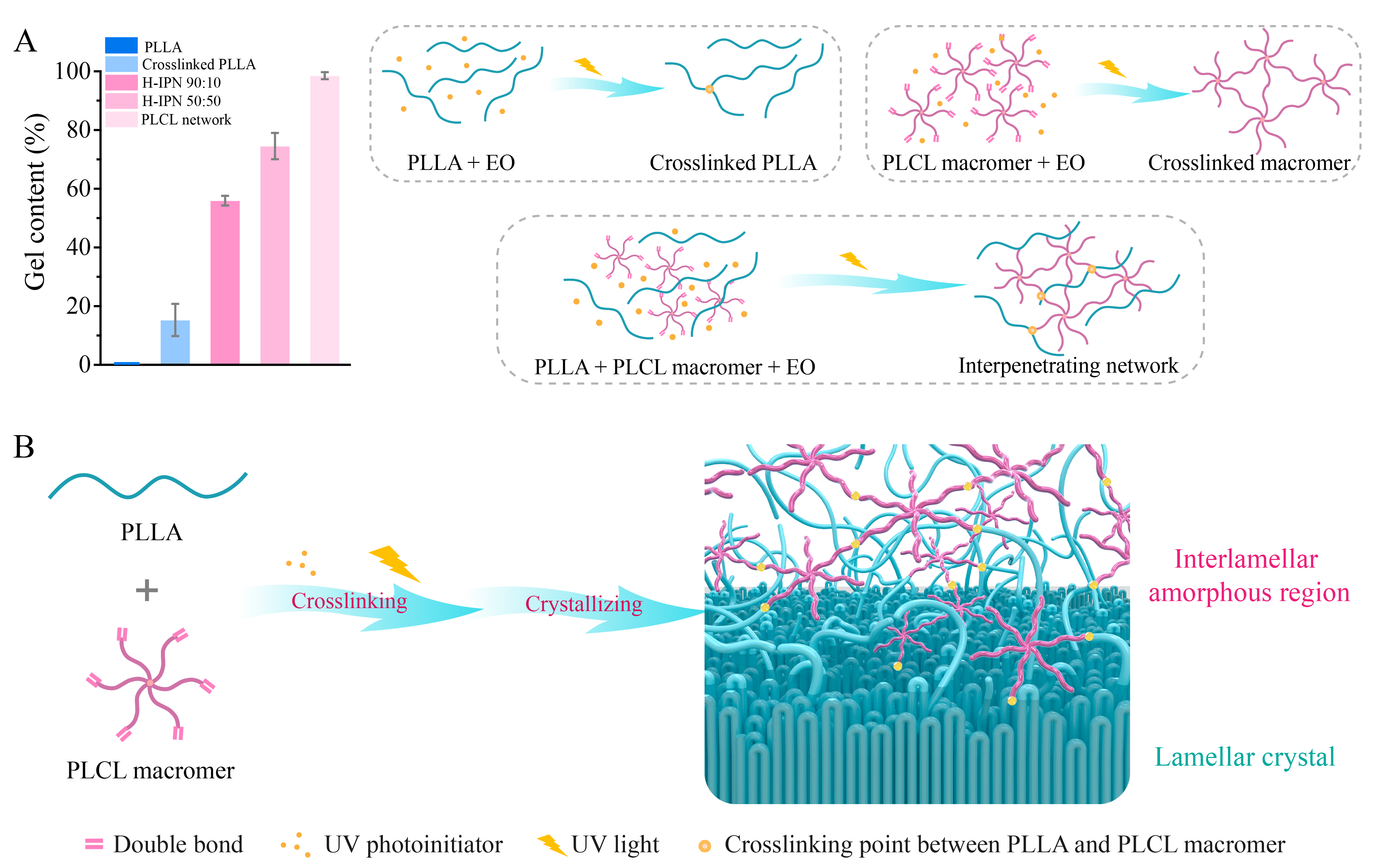 该材料内部包含物理球晶网络和化学交联网络,且化学交联网络分布在球晶网络中的非晶区域,贯穿于球晶网络中。H-IPN材料的形成过程依赖于精心设计的时间和温度的顺序。首先控制化学交联网络的形成,将温度控制在低于线型PLLA的熔融温度、但高于其结晶温度Tc,这样,初始阶段几乎不发生结晶,聚合物链段的运动能力较强,易于进行充分光交联。材料中的光引发剂被紫外光激活,光引发的自由基聚合和夺氢反应导致PLCL大分子单体和PLLA链之间形成交联网络(2)。