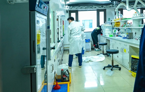 发现流淌火后,现场的学生立即拔掉电源(图1);与此同时,有学生从走廊上拿着灭火器回到实验室,用灭火器扑灭初始火(图2);袖口被点燃的学生慌乱中往水池边跑,在另一学生的协助受伤学生脱下实验服,同时有学生拿着灭火毯盖到扔在地上的实验服防止火情的扩大(图3);受伤的学生到水池边冲洗伤口约15分钟,然后涂抹烫伤膏,对伤口进行初步处理后,在其他同学的陪同下送医治疗。