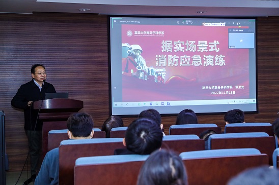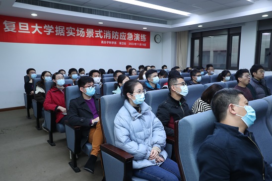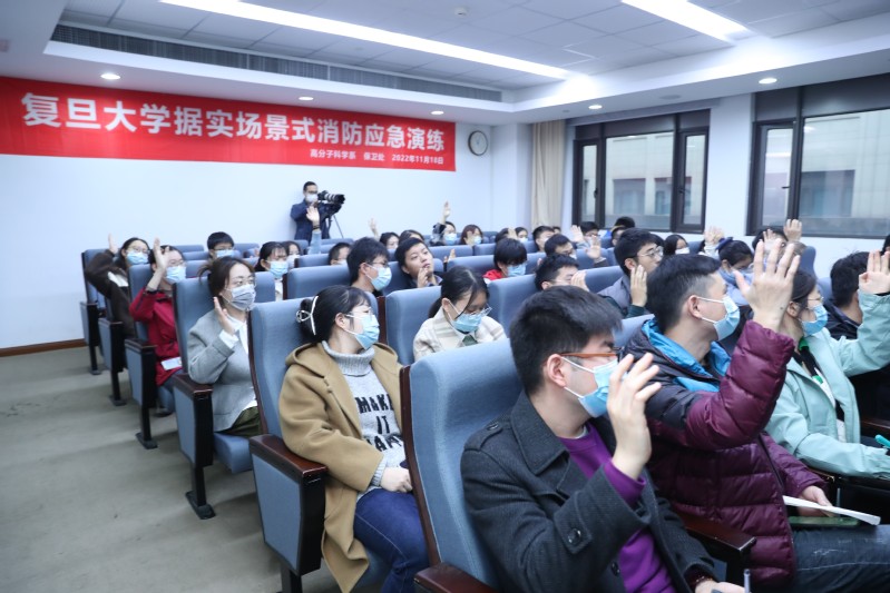 在点评专家的引导下,学生们从视频中积极查找本次演练中实验室现场同学的应急处置方法的不足之处(图21),参加演练的志愿者也分享了关于所采取的应急处置方法的思考(图22)。这次复盘活动持续了一个半小时,点评专家认为:复旦高分子系的演练志愿者们对于两个演练场景的应急处置方式是适当的,表明高分子系开设的《实验室安全知识与实践》课程达到了培训同学们掌握正确的应急处置方法的目的;肉漫屋 保卫处的应急相应速度快,事故现场处置方法规范、有效,应急疏散方案有效可行;院系与校保卫处的应急响应系统衔接有效;高分子上报事故的流程规范;在规定的时间楼内人员均撤出大楼,未发现有人员在紧急情况下乘用电梯疏散、或者躲入厕所内的现象,高分子系的应急疏散训练有素。