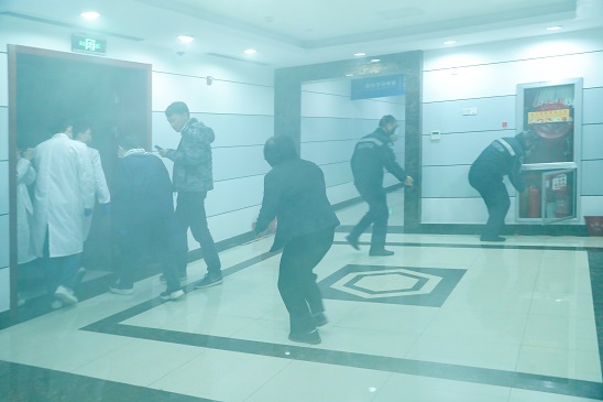 冰箱突发火情后,位于高分子楼一楼的保卫处中控室已发出警报,此时全楼警报响起,“请注意,请注意,现在报告本大楼内有火灾发生,此楼层将有可能受到火灾影响,保卫处正在调查核实具体情况,请您现在由疏散楼梯疏散到地面层,等到进一步指示,请不要使用电梯,以免受困。”的警报声全楼响起,楼内人员听到警报后迅速从大楼的四个应急疏散口分别向楼外疏散。