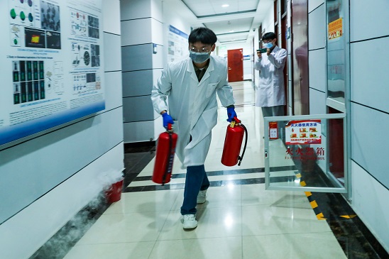 9时半开始,进入应急演练模拟的第二个场景:B5084实验室在进行实验中,周边冰箱突发火情(存放叔丁基异氰酸酯、炔丙基溴溶液、对甲氧基苄氯等)。为了增加应急处置难度,演练策划组特意将装有有机废液的垃圾桶移至发生火情的冰箱旁边,以检验同学们的应急处置能力。