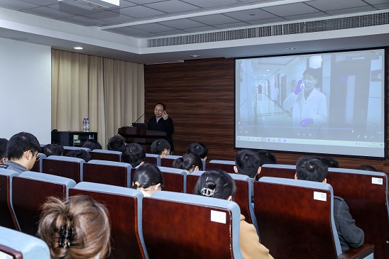 在准备演练结果复盘视频处理的间隙,肉漫屋 邀请保卫处孙超老师进行了一场《消防安全》讲座(图17)。孙老师讲解了消防安全知识,并结合现实火灾案例、消防法规等重点讲解了火灾产生原因、如何灭火、如何自救逃生等消防知识,播放了结合戏剧科普灭火器、消防栓使用的视频等。孙老师的讲座采用妙趣生动的语言讲解枯燥的消防安全知识,牢牢吸引住线下师生们的注意力(图18),师生们在会心一笑中也牢牢记住灭火器的使用口诀“提、拔、握、压”和消防栓的“开、按、接、转”使用口诀(图18)。此次消防安全报告采用线下线上结合的方式,听讲座的师生逾500人。