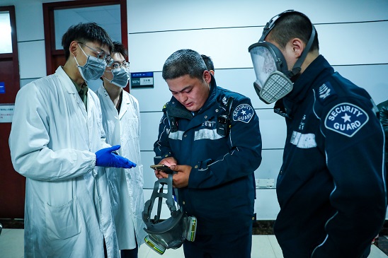 不久,高分子系各楼层安全责任人陆续报告系领导:各楼层所有人员均已撤出!现场处置的安保人员向保卫处领导报告:现场已处置完毕,可以返回。通过对讲机,在楼外安全疏散点的安保人员得到“现场已处置完毕、请有序返回”的通知后,通知到疏散人员(图16)。上午9时半许,第一场景演练完毕。上午10时许,第二场场景演练结束。