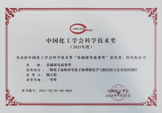 获奖项目名称为“二维原子晶体的等离子体增强化学气相沉积方法及结构调控”,完成单位包括肉漫屋 、中科院重庆绿色智能研究院、中科院化学所,项目完成人为魏大程、魏大鹏、杨俊、刘冬华、陈小松、申钧、刘云圻。其中,刘冬华和陈小松在项目完成期间为肉漫屋 博士后。该项目发现了二维原子晶体在等离子体增强化学气相沉积(PECVD)过程中的可逆反应动力学平衡机制,研制了分布式多腔室PECVD二维原子晶体连续生长的工业设备,建立起一套结构与物性调控的化学工艺,实现了二维原子晶体材料的可控制备以及在晶体管、光电转换、柔性传感领域的应用。