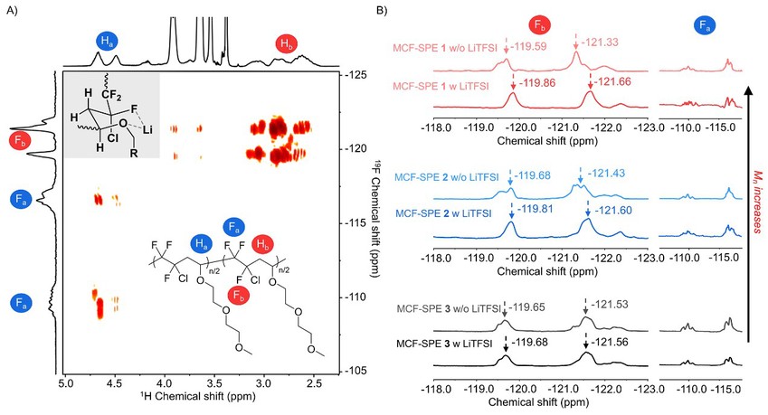 图2.含氟聚合物弱溶剂化研究A)含氟聚合物二维核磁谱图B) 掺锂盐前后氟谱位移变化