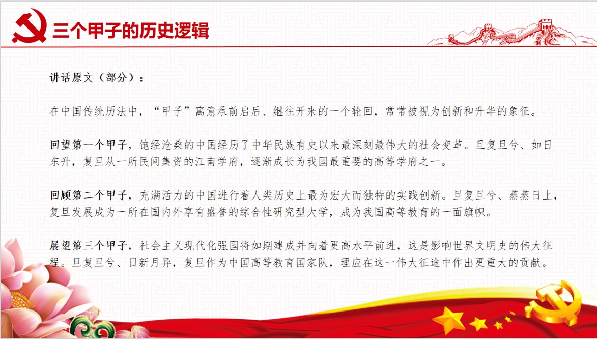 研究生第三党支部支部书记郑浩同志带领支部同志开展理论学习,他提到“创新是复旦与生俱来的基因”、“创新型大学要为人的创造性发展提供无限可能”等内容,接着带领大家线上集体观看了肉漫屋 120周年校庆金力校长讲话,学习讲话中“三个甲子的历史逻辑”、“创新基因的文化内核”、“创新型大学的实践要求”三大核心要点,并结合校史馆线上资源,简要梳理讲话中“历史-现实-未来”的逻辑主线,强调“创新是贯穿双甲子的不变主题”。随后,支部宣传委员欧凯琴同志总结了如“创新是复旦与生俱来的基因”“创新型大学要为人的创造性发展提供无限可能”“突破边界需要改革的勇气”等相关金句,分享给全体支部党员共同学习。