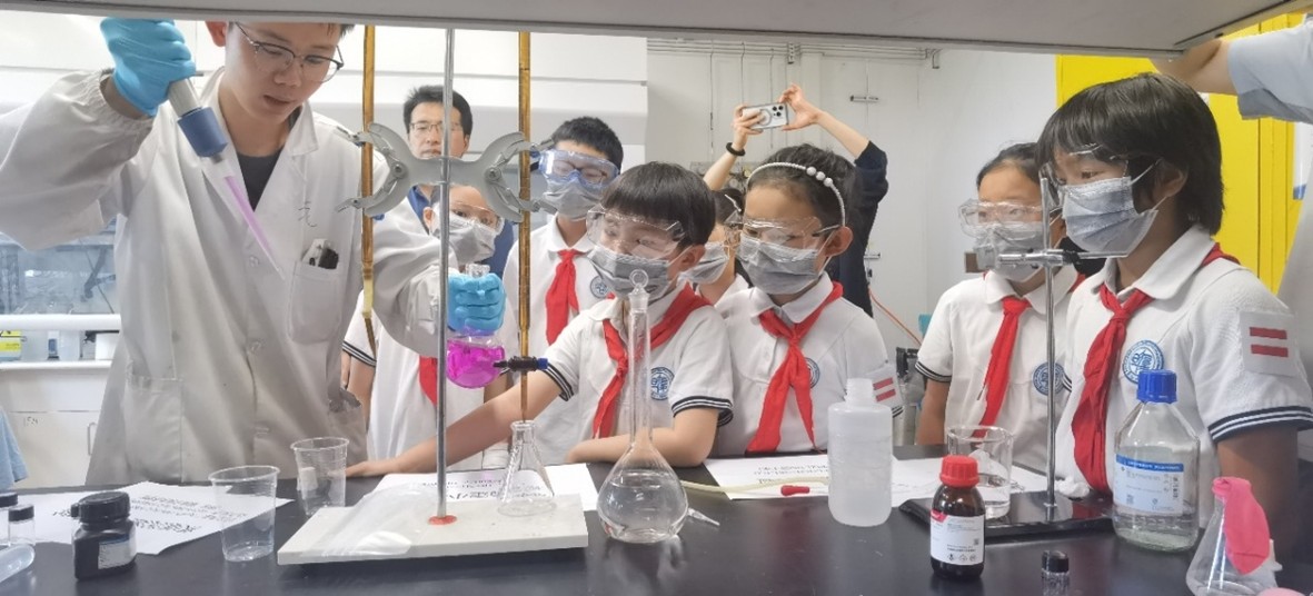 支部党员引导同学们参观了我系多个示范性实验室,向大家介绍了高分子材料研究的前沿领域与日常科研工作的环境,给予同学们对于科学探索更加直观的认识。随后,支部党员为同学们演示了生动有趣的化学实验:氨水喷泉实验引来阵阵惊叹,酸碱中和滴定计算激发了孩子们对化学原理的好奇;银镜反应环节中,每位小朋友亲手制作了属于自己的银镜小瓶,体验了科学动手实践的乐趣,在趣味互动中传递了绿色化学理念。