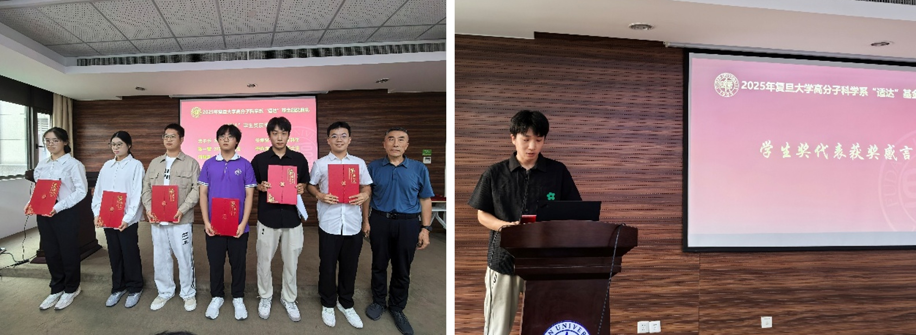 系党委书记刘顺厚为获得“适达”学生奖的贡子乔、任博贤、陈一萱、李昀龙、刘科延和史育龙六位同学颁奖。史育龙作为获奖学生代表发言。他代表获奖学生向“适达”奖的设立者李平夫妇表示感谢,他认为,“适达”的理念始终贯穿在大家的科研生活中,学术研究并不是一条直线前进的道路,要“适配”需求、“调整”方法,才能最终“达成”突破。未来,他会把这份荣誉当作新的起点,更加严格地要求自己:在学术上,保持严谨求实的态度,敢于挑战未知;在实践中,学会适应变化、拥抱挑战,努力成为一名有理想、有本领、有担当的复旦人、高材生。