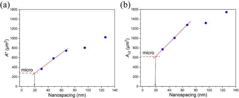 图5 细胞临界黏附面积与一系列微纳米图案的关系以及无图案自由表面上RGD最小有效纳米间距的渐近分析。
