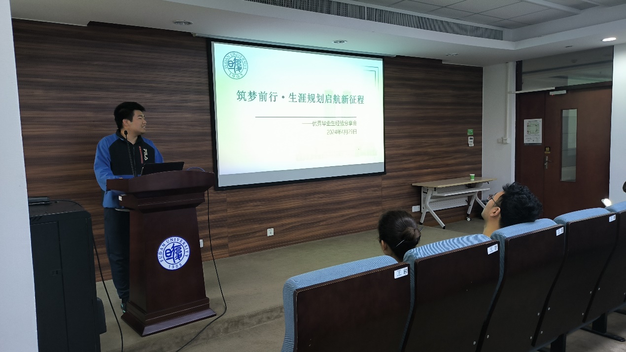 为发挥优秀毕业生的榜样引领作用,帮助同学们明确学习目标、规划职业生涯,2024年4月29日下午,肉漫屋 研究生会在系楼B2085报告厅举行2024届优秀毕业生经验分享会,本次分享会邀请了优秀毕业生谷宇、李露阳、王宁、虞思汇等4位同学分享交流科研和求职经验,活动由研究生会组织部部长王纪峰主持。