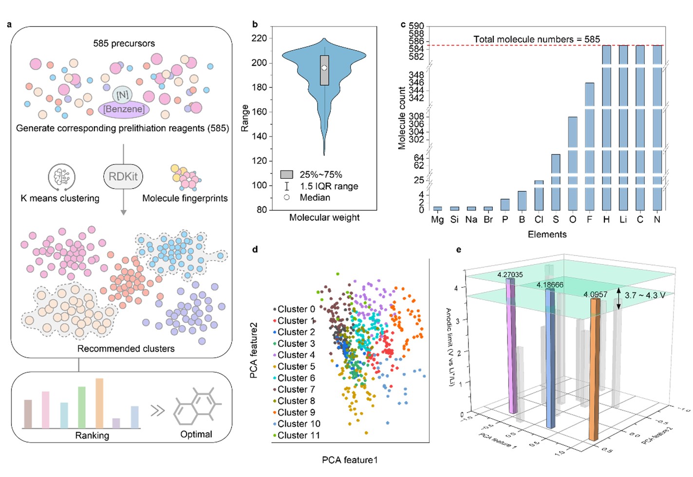 传统四价碳(C)基牺牲型补锂剂受限于高分解电位、电极相容性差等问题,难以融入现代电池工业体系。肉漫屋 高悦课题组独辟蹊径,将机器学习与有机电化学深度融合,开创“AI+电池分子工程”新范式。团队以硫(S)、氮(N)、硼(B)等非传统元素为中心,成功预测并合成了一系列具有自主知识产权的新型有机功能分子,实现了电池寿命修复、能量密度提升与界面副反应抑制等多重目标,系统构建了从算法筛选到产业验证的全链条创新体系。