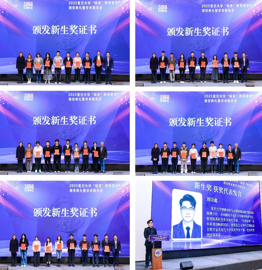 在复旦已度过七个春秋,刚刚开启博士生涯的智能材料与未来能源创新学院2025级博士生刘诗鑫同学代表全体获奖新生发言。“我的科研之路是从好奇走向坚定、从摸索走向专注的过程。”他引用汪国真的诗句与新生们共勉:“既然选择了远方,便无惧风雨兼程”。希望共同珍惜这份荣誉,在复旦的沃土上扎根生长,以探索之心追求真理,以创新之力回应时代!