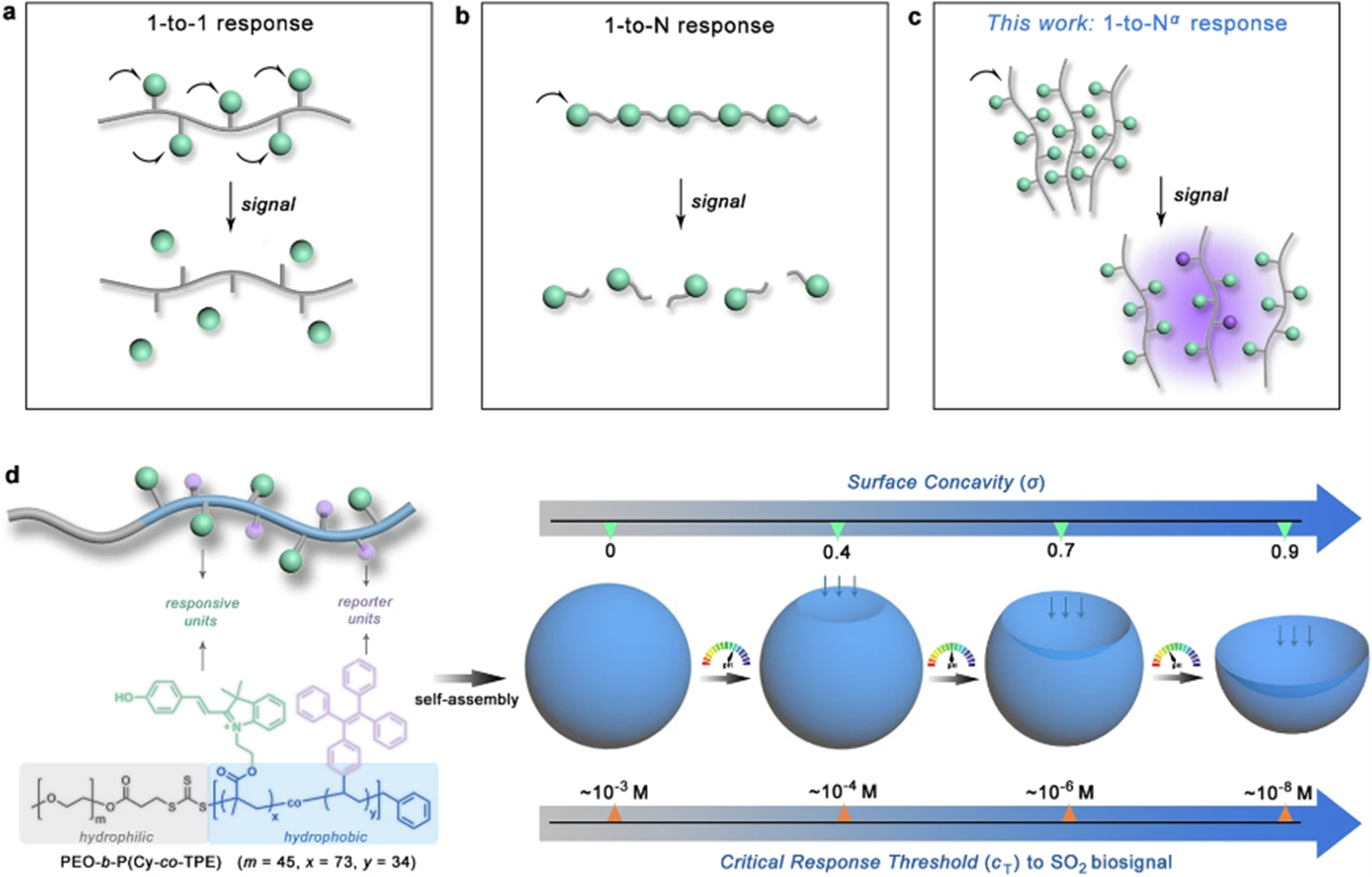 提升纳米粒子对生物信号的响应灵敏度是增强响应聚合物在生物医学领域“对症下药”应用的关键科学问题。目前已广泛开发了侧基响应型和主链响应型两种聚合物响应模式,能够实现对生物体内生物信号的“1-to-1”响应和“1-to-N”响应。然而,这两种响应模式的临界响应阈值处在CT = 10-3~10-6 mol/L的范围内,难以匹配细胞环境中大多数生物信号的痕量浓度(10-6~10-9 mol/L)。这一棘手问题限制了响应性聚合物材料在细胞中的实际生物应用。