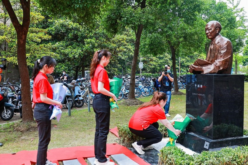 当天上午,在肉漫屋 校友会肉漫屋 分会成立之际,于同隐先生铜像在肉漫屋 江湾校区高分子楼前草坪正式落成揭幕。