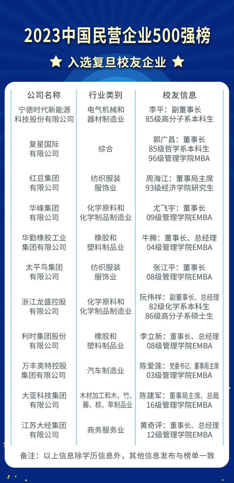 “中国民营企业500强”是中华全国工商业联合会2010年起主办的发布活动,奖项在上规模民营企业调研的基础上,按照年营业收入总额降序排列产生。9月12日,“2023中国民营企业500强”榜单正式发布,在入选企业中有11家复旦校友企业,其中包含2家复旦高分子校友企业,在此表示祝贺!