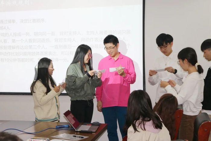 为了让新成员们可以迅速熟悉高分子研会这个大家庭,破冰活动举办了心有灵犀、谁是歌王、猜火车等游戏,成员们都以饱满的热情积极投入到活动当中,游戏环节在一片欢声笑语中进行。所有研会成员被分为“美不胜收”、“学无止境”、“知行合一”和“妙笔生花”四个小组,游戏采取了积分制度,最后根据每组的得分进行奖励与惩罚。最终,“妙笔生花“队发挥稳定,夺得桂冠。主持人为胜利队伍颁发神秘礼品,失败队伍也接受了惩罚。通过游戏活动不仅提高了大家参与研会活动的热情,促进了新老成员互相认识与了解,也有效提高了研会内部的凝聚力与向心力。