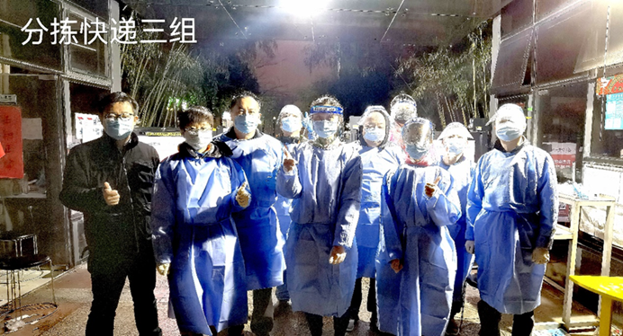 教工一支部徐一飞同志(右起第四位)担任所在社区的抗疫志愿者,协助进行抗原检测盒和快递的分发工作。