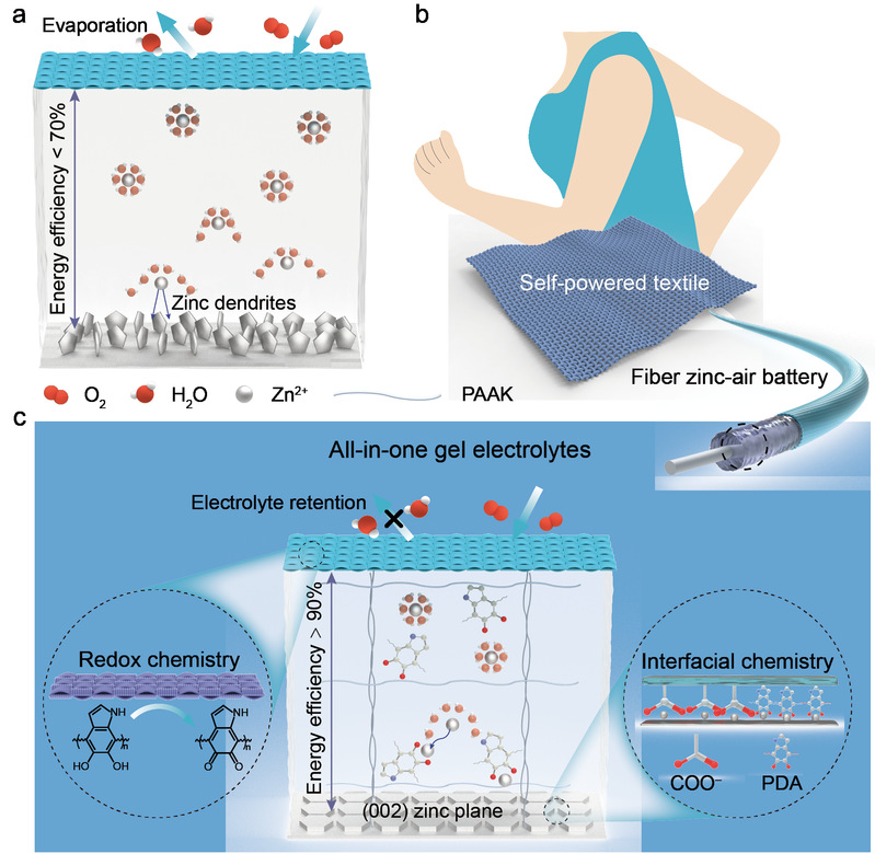 图1.用于纤维锌空气电池的多功能凝胶电解质的示意图。