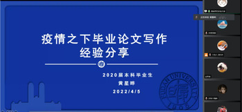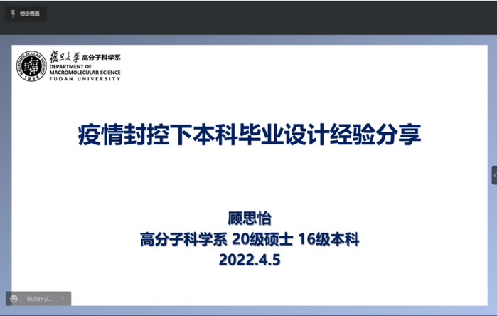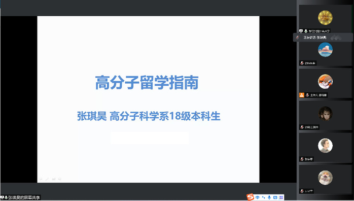 为帮助处于封闭管理、无法开展实验的大四同学规划科研方向、做好毕业设计,为向处于生涯规划关键期的大三同学提供出国留学方面的经验建议,继上次考研经验分享会之后,高分子系学生会组织开展了此次毕业设计及出国留学经验分享会。本次活动邀请了肉漫屋 冯嘉春教授以及四位优秀的学长学姐,向同学们分享疫情之下的毕业设计、出国择校及申请准备的经验心得。由于校园仍处于封闭管理状态,本次活动于4月5日在腾讯会议线上举行。