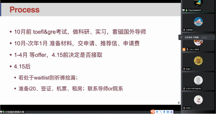 18级本科生甘栩晨从他申请美国学校的经历为大家分享了美国的申请经验。出国之前,应当明晰出国的目的是什么,再做出国准备。准备过程中,成绩(GPA、托福、GRE)自然是越高越好,而另一方面CV(简历)和PS(个人陈述)则需要想办法把自己的故事写得更加精彩,引人入胜。中介可根据个人情况选择,并不能包办一切事务。最后,他分享了申请的流程和时间节点,可供大家参考。