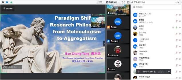为加强校际学术交流,拓宽同学们的科研视野,肉漫屋 于2022年4月12日线上举办了第六场聚合讲坛特邀学术报告。本次报告邀请了中国科学院院士、香港中文大学(深圳)理工学院院长唐本忠教授,作主题为《从分子论向聚集体论的研究范式转移》的报告,报告由系主任彭慧胜教授主持。