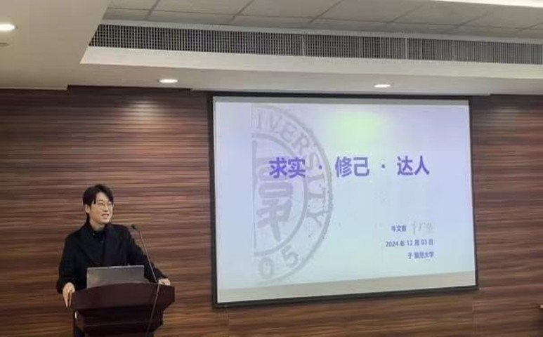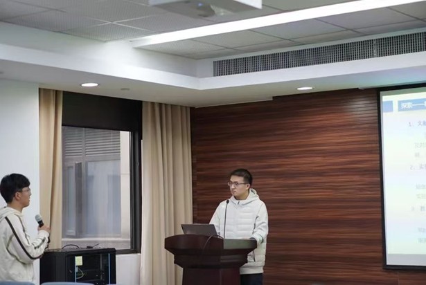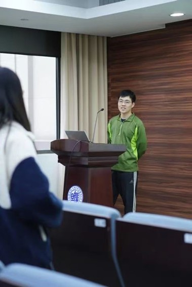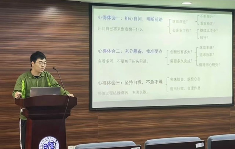 接着,2020级直博生牛文哲以“求实·修己·达人”为主题展开经验分享。他从自身经历出发鼓励大家直面科研中遇到的困难,课题进行过程中难免遇到瓶颈期,要多和有经验的人沟通交流。同时,他建议大家及早与导师讨论课题方向,广泛阅读文献调研与交流,善于听取有效的建议,不给自己设限。在有一定成果的前提下多去参加学术报告,看一下别人是怎么展示自己的成果,怎样开展研究的。他认为一个报告人的思路很重要,报告人应该清晰地展示自己的研究逻辑,大家可以去学习。最后他鼓励大家劳逸结合,多出去看看世界,行遍千里路,但不要忘记自己的初衷。