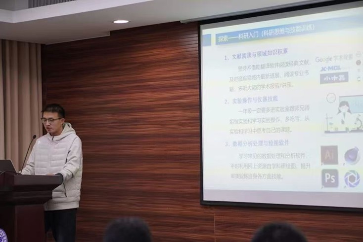 最后,2020级直博生李鹏洲以“探索·挑战·成长”为题进行经验分享。他首先向大家推荐了两本书,一本是《读研究生:你准备好了吗》,另一本是《那些我希望在读博前知道的事》。他提到自己初读没有太大感触,但当自己经历了一段研究生阶段之后,再去翻看这两本书时,会有很大的体会和感悟。他建议大家进入研究生阶段之后,要摒弃以自我为中心的“学生思维”,培养适合成年人身份的“利他”与“合作思维”,发现学习周围每个人的优点,充分利用身边一切资源。他鼓励大家直接阅读英文文献,不要用翻译软件,培养自己的英文能力。最后他建议大家要把握好自己的节奏,对自己的课题有自己的预期,不要盲目和周围人进行对比。他提到绝大多数同学都会遇到瓶颈期和焦虑的阶段,这个阶段一定会过去,大家一定要调整好自己的心态,最终也一定会顺利毕业。