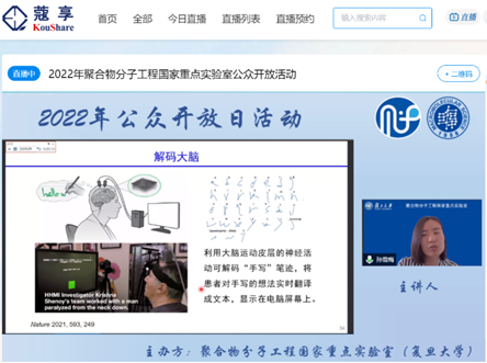 讲座之后,通过视频带领观众云参观聚合物分子工程国家重点实验室。视频中介绍了实验室大气明亮的科研环境、各领域的名师良导、各方向的代表研究成果、共享仪器平台及近年内由国重室主办的多场国内外学术会议。通过短视频,公众对聚合物国重室的科研条件、人才培养等方面有更直观的了解和认识。