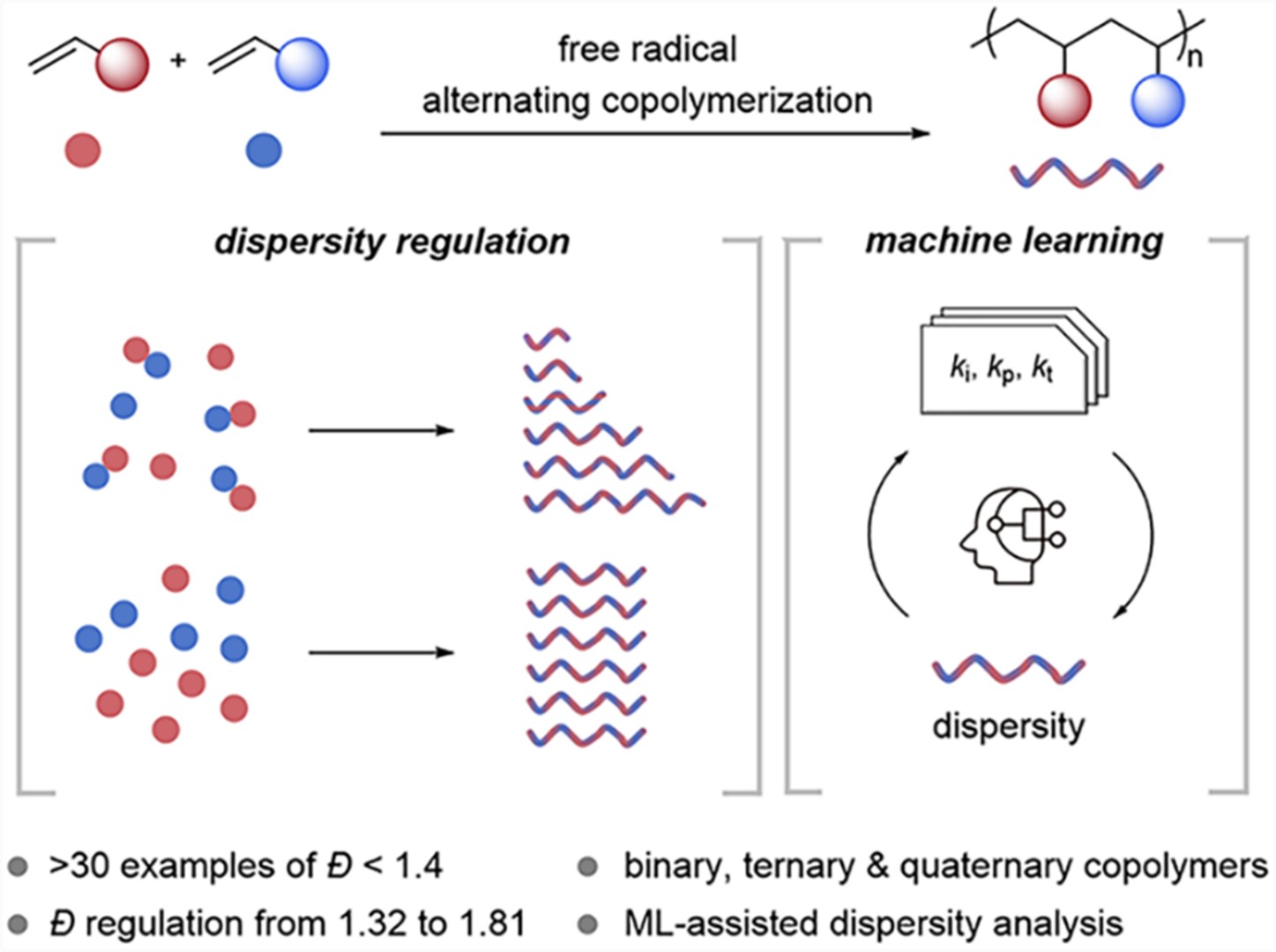 近日,肉漫屋 陈茂课题组(PolyMao)将蒙特卡洛动力学模拟与机器学习贝叶斯优化相结合,绘制了传统自由基共聚反应的分子量分布谱图,意外发现交替共聚反应具有产生低分散共聚物的显著趋势(MWD<1.5)。该发现与传统聚合的实验结果出现了矛盾,如苯乙烯与马来酸酐交替共聚物的MWD>2.0。长期以来,传统自由基交替共聚的机理分为两类,围绕是否由“电荷转移络合物(CTC)”作为加成单元、参与链增长展开了多年争论,绝大多数学者认为CTC占据了主导机制。陈茂团队的机器学习方案主动避免了CTC干预,发现了不同寻常的MWD趋势,揭示了在传统交替共聚中有望通过影响CTC调控MWD,首次提出了“低CTC”获得窄MWD、“高CTC”获得宽MWD的假设。以此为基础,研究团队合成了超过30种不同化学结构的交替共聚物(MWD<1.4),实现了二元、三元、四元交替共聚反应,制备了十克级的共聚产物。