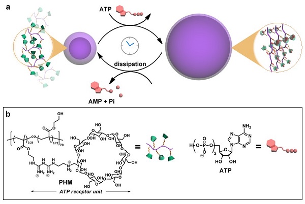 时至今日,自组装科学(Self-Assembly Science)已取得了极大成就,各种类型、各种形貌、各种功能的组装体已广泛应用于各个已知的领域。从物理化学角度上来看,这些熟知的自组装体系全部受控于经典热力学原理(thermal equilibrium-control),稳定于能量最小的热力学平衡态,体系平衡一旦建立,所有参量将不随时间变化;但实际上,生物体内绝大部分自组装体系并非如此运作。截然相反,生物组装体受控于耗散热力学(dissipation-control),体系必须依托外界能量的持续输入才能表现出瞬态组装的趋势,一旦失去能量供给或能量消耗,组装体立即表现出解组装的行为。体系始终运行在高能量的非平衡态,所有参量随时间呈现周期性变化。模拟这种能量驱动的耗散自组装(dissipative self-assembly)是真正构造仿生组装体的基础。但是,目前相关研究非常罕见,其原因主是将能流输入/输出有序整合到分子组装体内部非常困难。