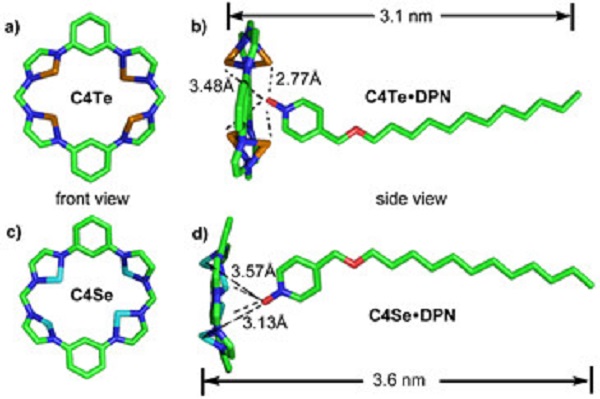 基于此,肉漫屋 闫强课题组设计并合成了一系列含四中心硫族元素的新型类杯芳烃分子C4Ch (Ch = Se, Te),其可以通过形成多重硫键相互作用选择性识别带有含N-氧负离子的表面活性剂DPN,生成硫键超两亲分子(C4Ch•DPN),进而发生自组装形成各种高度有序的纳米结构(图1)。研究还发现,不同的氧族元素可诱导不同的硫键化学,类杯芳烃分子中心元素从硒(Se)变换到碲(Te)后,可导致自组装结构从零维纳米囊泡体转换到一维纳米纤维结构。研究还利用分子模拟直接揭示了两种不同的硫键超分子复合物的分子结构,及其差异化的硫键强度所引起的自组装形貌不同之间的联系(图2)。而且,利用卤素阴离子或氢键与该大环主体之间的竞争相互作用,可以实现自组装结构的可逆组装行为调控。我们期望利用这类含多重硫键相互作用的大环供体能够指导并开启一类基于硫键的新型超分子自组装策略。