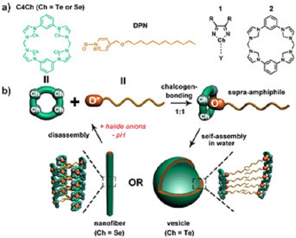 硫族元素键(chalcogen-bonding)是一种最近刚确认的超分子弱相互作用,广泛存在于第六主族(S, Se和Te)元素之间,其作用本质是σ空穴与σ*轨道之间的相互耦合。这种超分子作用力尽管比较微弱、难以探查,但在指导生物蛋白折叠与生物分子识别中具有不可替代的功能。但截止目前,人工合成的具有硫键相互作用的分子仅存在与气相分子或分子晶体中。利用硫键弱相互作用驱动有机分子在介观或宏观尺度的自组装行为和相关研究仍然未有涉及。