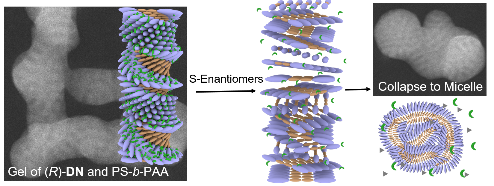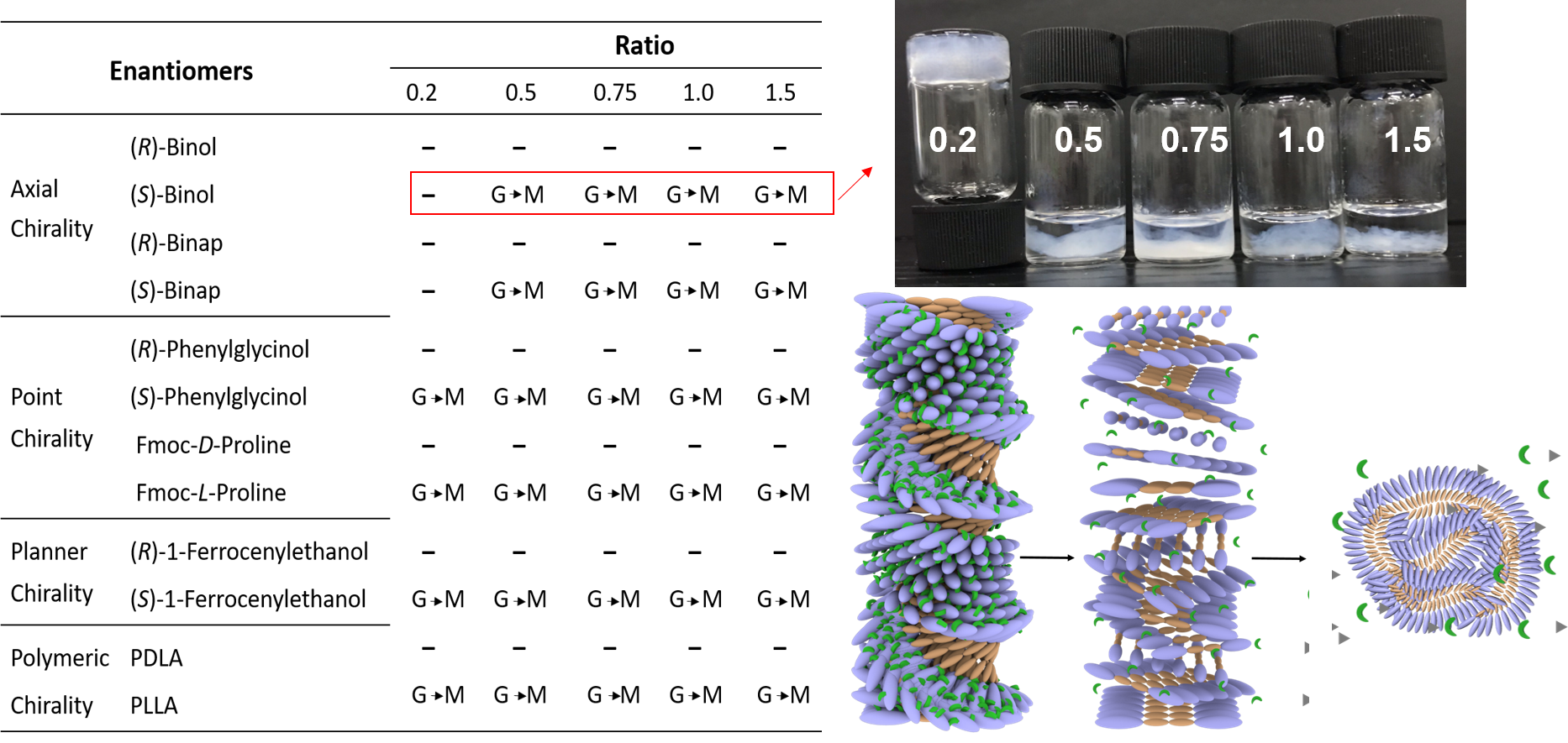 Fig. 1 共组装超分子手性结构以及对映体识别凝胶-胶束变化