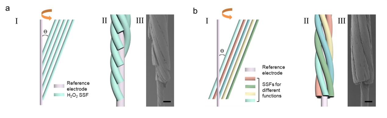 近日,肉漫屋 彭慧胜-孙雪梅团队提出并发展得到一种可注射的纤维状生物传感器。这类新型纤维状生物传感器具有稳定的电化学性能、与组织相匹配的力学性能、优异的生物相容性和生物整合性,能够实现对体内多种化学物质进行长期、实时监测。10月28日,该项研究成果以“Functionalized helical fibre bundles of carbon nanotubes as electrochemical sensors for long-term in vivo monitoring of multiple disease biomarkers”(螺旋碳纳米管纤维电化学传感器实现了多种疾病标记物的长期体内监测)为题,在线发表于《自然-生物医学工程》(Nature Biomedical Engineering)杂志。