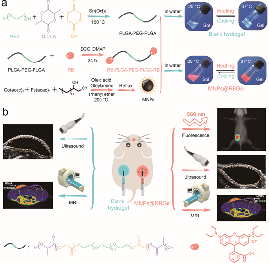 团队分别设计合成了一种大分子荧光探针和一种磁共振成像造影剂。体外流变学测试表明,两种探针的引入不影响PLGA-PEG-PLGA热致水凝胶体系的凝胶化行为。在小鼠皮下注射载有两种探针的PLGA-PEG-PLGA水凝胶后,能够通过超声、荧光和磁共振成像三者协同地示踪凝胶在体内的降解过程。将无损成像示踪与传统解剖观察相结合后,首次提出PLGA-PEG-PLGA热致水凝胶体内降解过程的三阶段机理:PLGA-PEG-PLGA热致水凝胶体内降解的第一阶段由表面溶蚀控制,随后转变为表面溶蚀与PLGA嵌段水解相结合的降解机制,而最后一阶段降解则由残余的PLGA嵌段水解机制起主导作用。在整个体内降解过程中,凝胶的含水量由于溶胀先呈现短暂上升,然后持续下降直到一个恒定的水平。研究还发现,溶蚀的PLGA-PEG-PLGA聚合物及其降解产物主要通过肝、胆和脾脏进行消除。因此,该研究不仅深入地揭示了PLGA-PEG-PLGA热致水凝胶在体内的降解过程,而且有助于推动该类水凝胶未来的临床应用。
