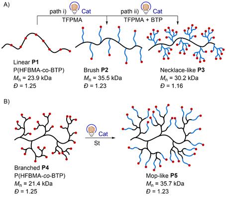 通常,为合成不同拓扑结构的聚合物,人们需要从不同原料组合(单体、引发剂/链转移试剂)出发。例如,在可控自由基聚合中,单体与常见引发剂通常导向线性聚合物。为获得(超)支化聚合物,人们进而设计发展了由特定引发剂/链转移试剂导向的合成方案。
