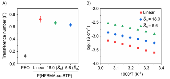 图3. 电化学性能的研究. A)PEO,线性和支化氟聚合物的锂离子迁移数(t+). B)线性和支化氟聚合物的离子电导率(σ)与温度的关系.