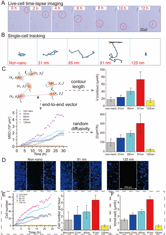 图2 细胞在RGD纳米图案化表面的迁移: (A) 单个细胞在91nm间距表面的12小时的活细胞迁移情况;(B) 与不同纳米间距相应的单细胞迁移轨迹; (C) 运用模型统计细胞迁移速率; (D) 使用划痕实验考察细胞在不同RGD纳米间距下的集体迁移情况; (E) 对划痕中的细胞数目作统计;(F) 对中位细胞的迁移速率作统计,以此来表征细胞在不同配体纳米间距下的群体迁移的速率。