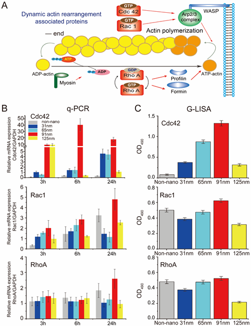 丁建东课题组还运用了RT-PCR、G-LISA、Western blot等基因和蛋白质表达的检测从分子水平探索造成这种迁移速率差异的原因(图3)。结果表明,随着纳米间距的增大,与细胞骨架中的张力丝动态变化速率相关的基因及对应的蛋白Cdc42、Rac1、RhoA的表达呈现出先升高、再降低的趋势,并与细胞迁移的速率变化相一致。这说明了配体纳米间距调控了细胞骨架中的张力丝的动态变化速率。