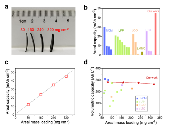 实现超厚电极的构建,面积负载量最高达320 mg/cm2。随着负载量的增加,离子传输通道始终畅通无阻,活性物质克容量无明显衰减。最终,在38%的孔隙率下,最高面积容量达45.4 mAh/cm2。