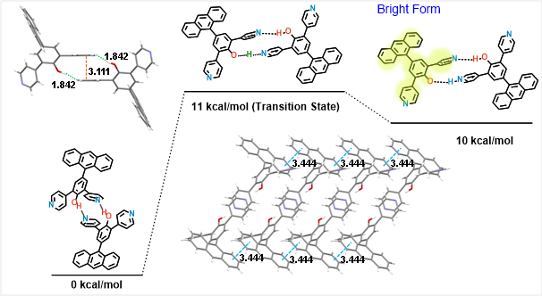 研究人员通过不断的尝试,得到了一种经过蒽修饰的双吡啶苯酚的化合物的单晶数据。这一数据证实了这种双氢键的存在。在这一单晶的基础上经过计算发现,这一双氢键结构发生质子转移的能垒很低,这也是能发生质子转移的主要原因。