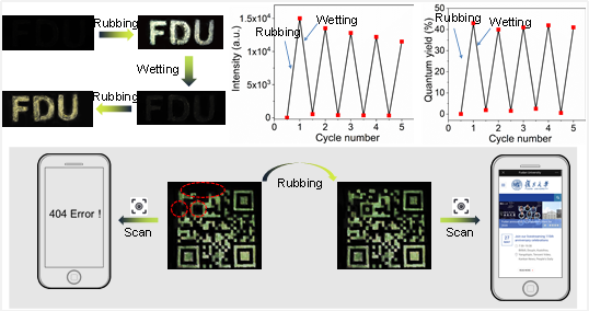 对于这一有趣的性质,研究人员还进行了其循环实验的研究,经过摩擦的化合物在缓冲溶液中浸泡后,其发光性能会明显减弱。对其干燥处理后再进行摩擦即可重新点亮。这一循环过程中,化合物的量子产率没有明显的降低。研究人员还设计了以此为基础的防伪二维码,其中,对大部分信息点位喷涂与双吡啶苯酚发光相近的材料为基础发光物质,选取其中的几个信息点位喷涂双吡啶苯酚材料,这样便可以得到一幅在紫外灯下有缺失的二维码。通过橡胶的摩擦后,这些隐藏的信息点位被点亮,在紫外灯下便可获得完整信息的二维码。这一信息防伪技术在未来的信息社会中将有着巨大的发展潜力。