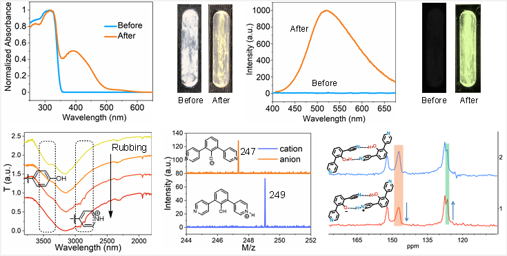 通过光谱分析,研究人员发现,在橡胶摩擦的前后,化合物在400 -500 nm之间出现了新的吸收带,使得其在日光灯下表现为黄色固体粉末,而在525 nm附近出现了一个从无到有的发射峰,使其在紫外灯下发出明亮的黄绿色的荧光,量子产率达到了45%。并且通过红外,质谱,固体核磁等表征手段,均捕捉到了这一质子转移的过程。